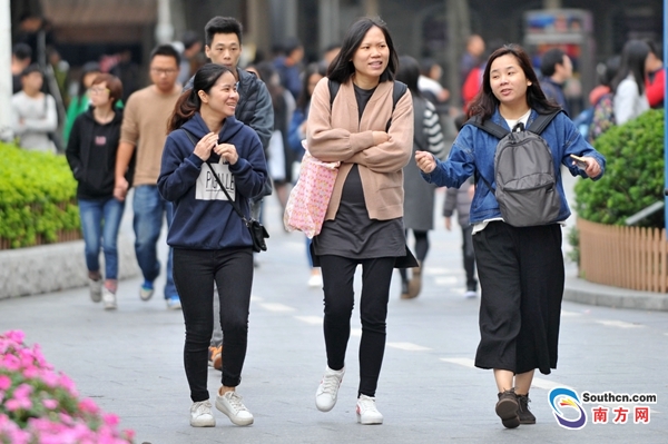 佛山祖廟路,周末降溫,怕冷的市民穿上厚衣服。 南方日報記者 戴嘉信 攝