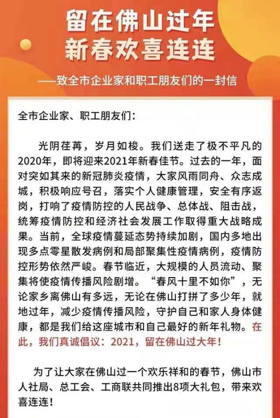 12日,佛山市多部門聯(lián)合推出8項(xiàng)禮包,號(hào)召?gòu)V大職工盡量留在佛山度過一個(gè)歡樂祥和的春節(jié)。