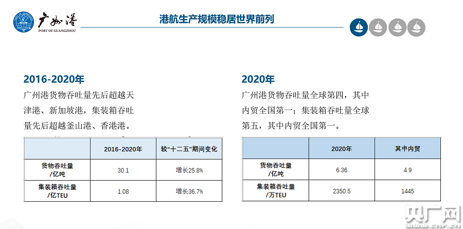 2020年,廣州港貨物吞吐量6.36億噸,全球第四,其中內(nèi)貿(mào)4.9億噸,全國第一;集裝箱吞吐量2350.5萬TEU,全球第五,其中內(nèi)貿(mào)1445萬標(biāo)箱,全國第一。