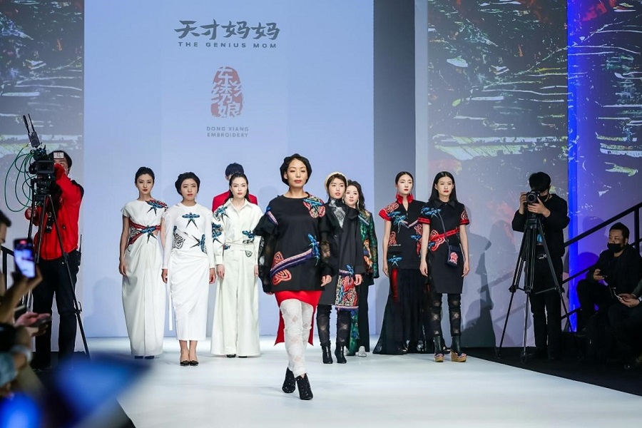 公益時裝秀以“民族等于潮流”為設(shè)計主題,將東鄉(xiāng)繡娘的民族傳統(tǒng)繡片與現(xiàn)代電腦印花及繡花結(jié)合貫穿整場發(fā)布。