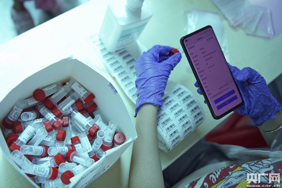 醫(yī)護(hù)人員核驗市民預(yù)約信息,發(fā)放采樣瓶。(央廣網(wǎng)記者 官文清攝)