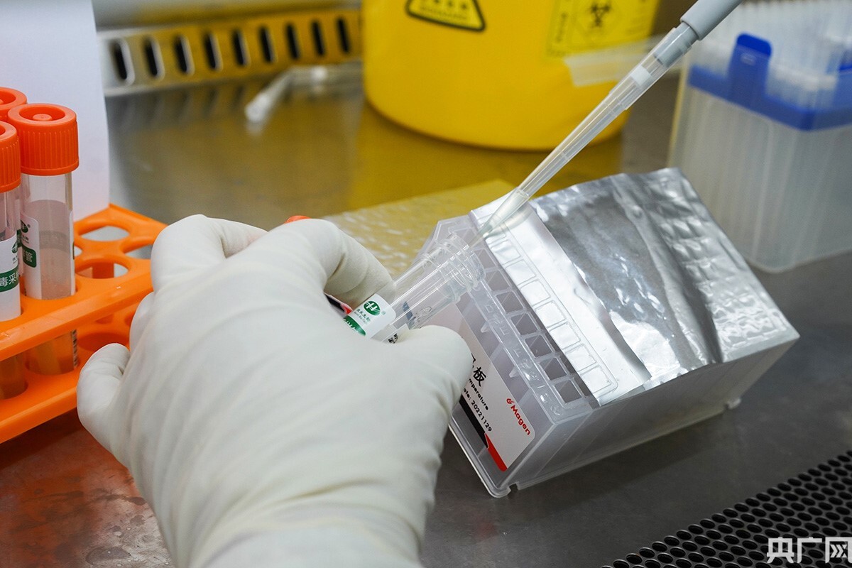 核酸樣本經(jīng)分離和提取后,工作人員加入核酸檢測陰陽性質(zhì)控試劑。(央廣網(wǎng)記者 官文清 攝)