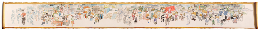 “吳川卷寄托的是我對(duì)家鄉(xiāng)的思念,所以在構(gòu)圖上也會(huì)更直白一些,就是用長(zhǎng)卷的形式,把大家排隊(duì)做核酸的場(chǎng)景表現(xiàn)出來(lái)!标愔窘芙忉屨f。