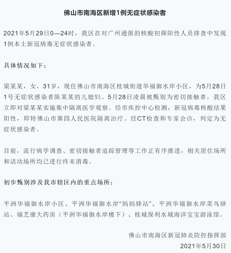 此次新增的無(wú)癥狀感染者梁某某,女,31歲,現(xiàn)住佛山市南海區(qū)桂城街道華福御水岸小區(qū),為5月28日1號(hào)無(wú)癥狀感染者陳某某的兒媳婦。28日當(dāng)天,陳某某的兒子已被判定為無(wú)癥狀感染者,孫女(1歲1個(gè)月)被判定為確診病例,臨床為輕癥,由省市兩級(jí)醫(yī)療專(zhuān)家共同救治。