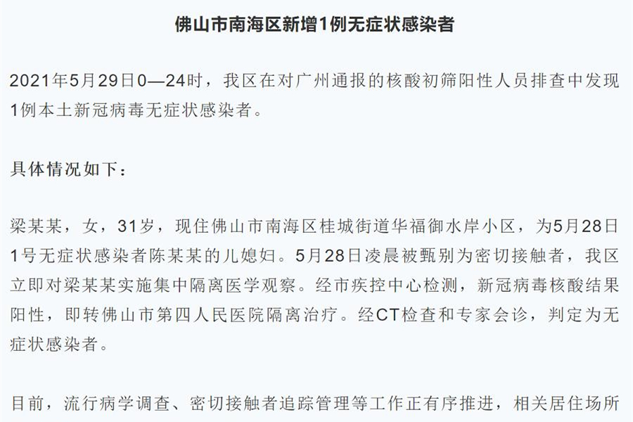 5月30日,佛山市禪城區(qū)報(bào)告1例本地新冠肺炎確診病例。據(jù)稍早前通報(bào),該病例為女,40歲,現(xiàn)住佛山市禪城區(qū)綠茵鳴苑,5月27日判定為無癥狀感染者。5月30日,出現(xiàn)發(fā)熱癥狀、復(fù)查CT顯示肺部有炎癥,經(jīng)專家會(huì)診,診斷為確診病例。