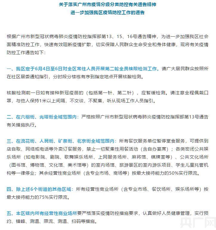 六榕街、光塔街全域范圍內(nèi):嚴(yán)格按照廣州市新型冠狀病毒肺炎疫情防控指揮部第13號(hào)通告有關(guān)措施執(zhí)行。