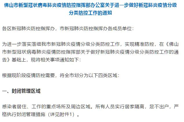 其中,人員出行方面,將精準(zhǔn)實(shí)施分級(jí)分類管控措施,嚴(yán)格落實(shí)涉疫重點(diǎn)區(qū)域管控要求,確保封閉區(qū)域內(nèi)人員足不出戶,封控區(qū)域內(nèi)人員只進(jìn)不出;廣大市民群眾非必要不離開佛山、不出省,確需離開佛山、出省的,需持有48小時(shí)內(nèi)核酸檢測(cè)陰性證明(48小時(shí)內(nèi)陰性證明要求自6月7日12時(shí)起實(shí)施)。