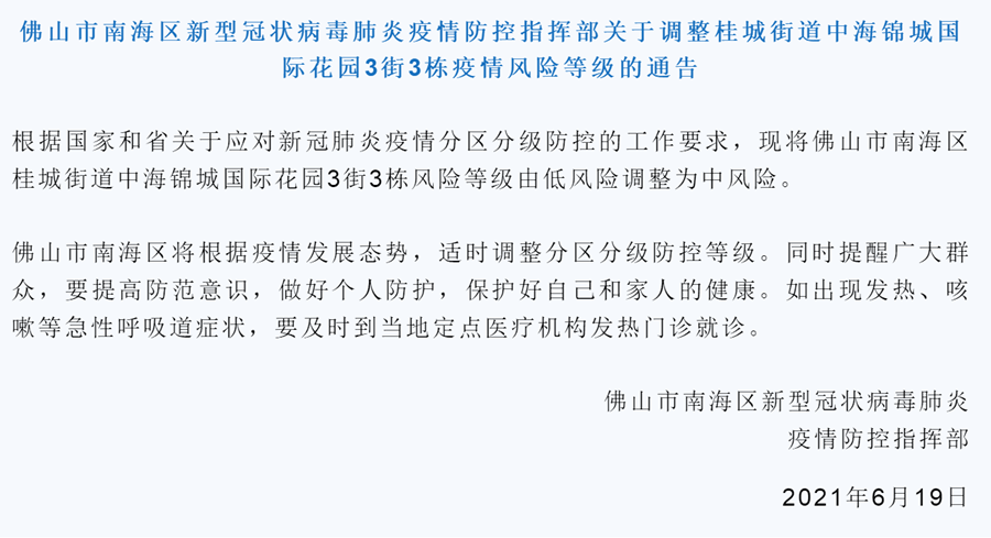 央廣網(wǎng)佛山6月19日消息(記者夏燕)6月19日晚,佛山市南海區(qū)新型冠狀病毒肺炎疫情防控指揮部發(fā)布通告,現(xiàn)將佛山市南海區(qū)桂城街道中海錦城國際花園3街3棟風(fēng)險(xiǎn)等級(jí)由低風(fēng)險(xiǎn)調(diào)整為中風(fēng)險(xiǎn)。