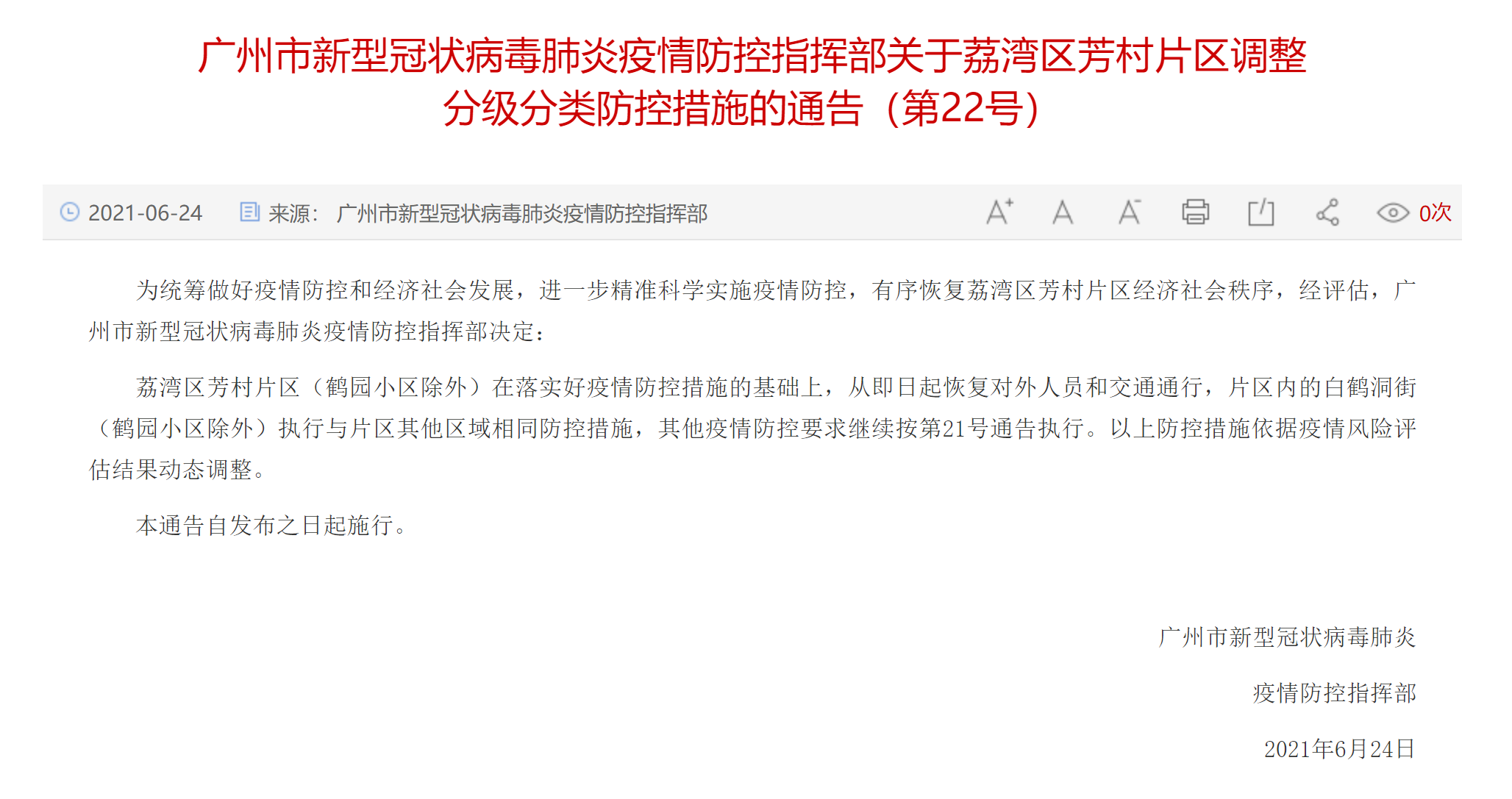 據(jù)通報,6月24日0至24時,廣州無新增境內(nèi)感染病例報告,已連續(xù)6日零新增。