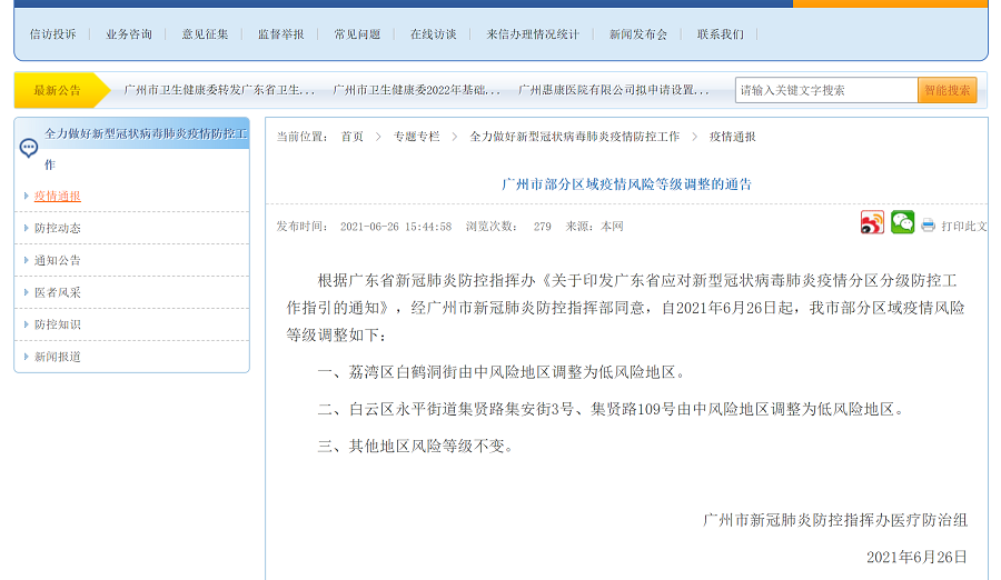 2、荔灣區(qū)白鶴洞街由中風(fēng)險(xiǎn)地區(qū)調(diào)整為低風(fēng)險(xiǎn)地區(qū)。