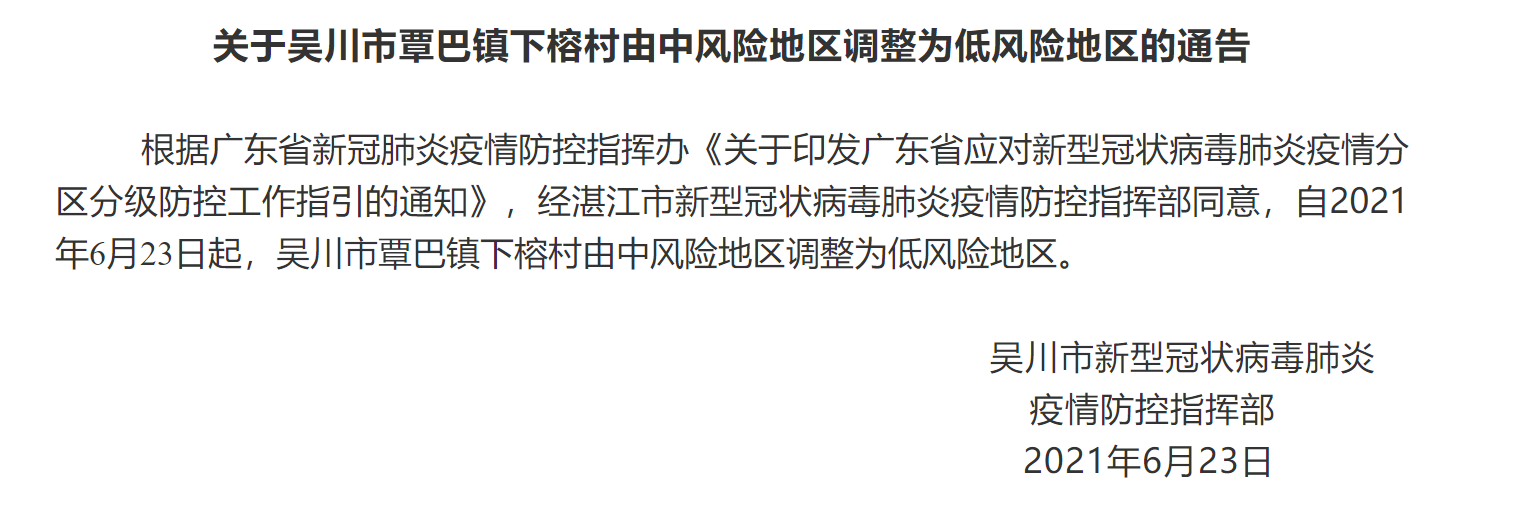南方日報訊 (記者/顧大煒 實習生/劉梓薇)6月27日,湛江市衛(wèi)生健康局發(fā)布消息,2021年6月26日0時至24時,湛江市無新增新冠肺炎確診病例,無新增無癥狀感染者,新增出院1例境內(nèi)確診病例。至此,湛江本土確診病例清零。