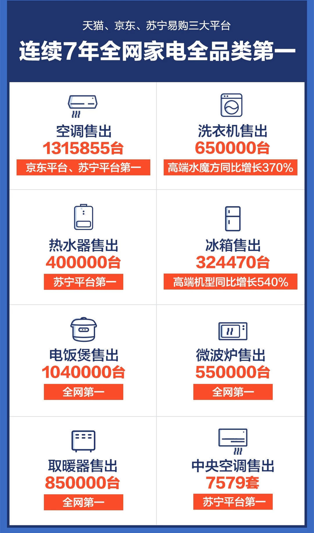 從細(xì)分品類看,單項“賽場”成績依舊亮眼:電飯煲、微波爐、取暖器三大品類均位居全網(wǎng)第一;熱水器和中央空調(diào)兩大品類均在蘇寧平臺銷售第一;空調(diào)銷售量達(dá)到131.58多萬臺,在京東平臺和蘇寧平臺上排名第一。