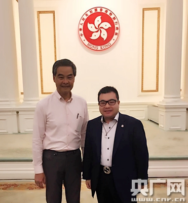 灣仔中西區(qū)工商業(yè)聯(lián)合會李鋈發(fā)主席(右)與行政長官梁振英先生合影留念