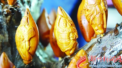 “欖核雕刻使用較多的是烏欖核,而潮州本地烏欖核產(chǎn)量較少,一般要從增城、揭陽等地采購!编嵙紭懈嬖V記者,而外觀完好、無裂紋的烏欖核,需要放置布袋中一個(gè)多月,任其自然陰干,使核內(nèi)的水分完全蒸發(fā),才能用來雕刻。