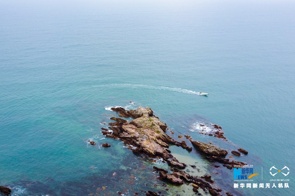蔚藍(lán)的海,海浪拍打著礁石,船只穿過,好一幅美麗的畫卷。新華網(wǎng)發(fā)(陳楷攝)