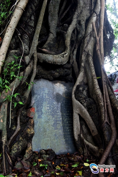 南方網(wǎng)訊 前往惠州惠東縣平海圩鎮(zhèn),經(jīng)過(guò)佛園村村口時(shí),會(huì)看到兩棵枝葉茂密的大榕樹(shù)。更為稀奇的是,其中一棵有著500年樹(shù)齡的大榕樹(shù)根部“長(zhǎng)”著一塊古石碑,究竟是怎么回事?石碑上寫(xiě)著啥?