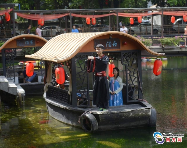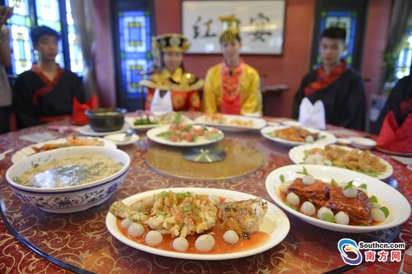 入場(chǎng)儀式過(guò)后,上演“彈絲樂(lè)禮”古箏彈唱表演,古代君王們功業(yè)成就才做樂(lè),天下平定了才成禮。隨后接著的“嶺南舞韻”更是增添了宴會(huì)上的歡愉氣氛。在紅云宴期間湖面上還有緩緩行駛的一條船,船上一人舉酒杯,一人捧酒缽。船隨岸而行,每到坐客處即停?腿吮闳”嬀疲瑢⒈給舉酒杯的人,捧酒缽人斟酒滿(mǎn)杯,船再前行。