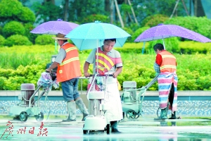 廣州海心沙,工人在特制的遮陽傘下打磨音樂噴水池的地面。