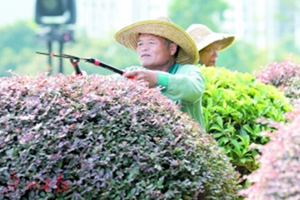 綠化工人在海心沙修剪花圃的植物,一頂草帽擋不住頭頂炙熱的陽光。