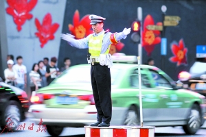 中山五路與吉祥路路口,一位交警在熱浪中指揮交通。