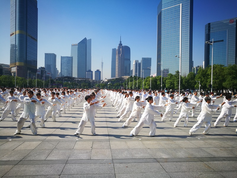 當(dāng)天上午,2017廣州千人太極展示活動在天河體育中心南廣場舉行,近千名太極拳愛好者動作整齊劃一,與宏大的天河體育中心交相輝映。