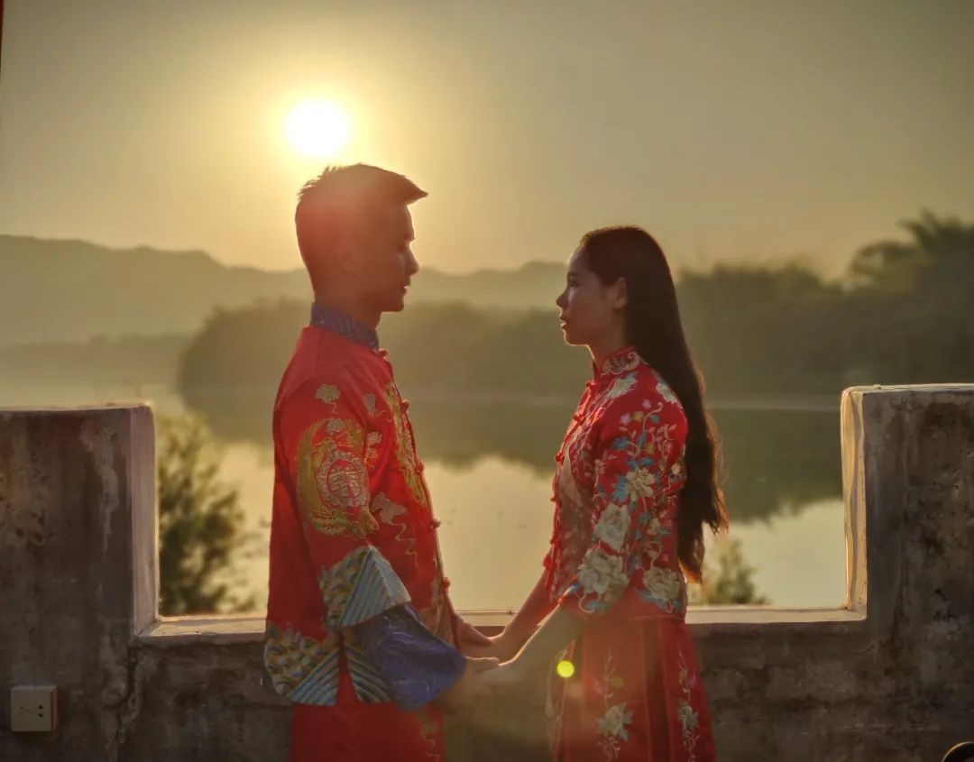 凌晨四點半,幾乎一晚上沒合眼的易德育起了床,套上大紅喜袍,在魚咀村的咖啡館門口搓著手走來走去,他的新娘子陳春玲還在房間里化妝。七十多歲的邱阿婆和林阿伯從家里端來燒雞白酒、桔子蘋果、生菜小蔥,沏了一壺?zé)狎v騰的英紅九號,等著一會兒去玉虛宮給新人們祈福。今天是易德育和他五個扶貧工作隊同事集體婚禮的大日子。