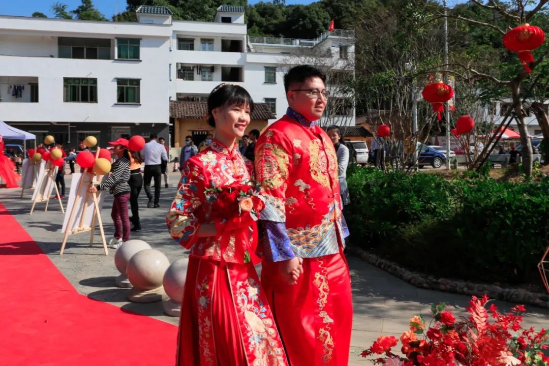 從魚咀開車一個多小時,就到了英德連江口鎮(zhèn)連樟村,6對新人在汀步觀景臺舉行了簡單的婚禮儀式。2018年習(xí)近平總書記在連樟村考察時說:“鄉(xiāng)親們一天不脫貧,我就一天放不下心來!爆F(xiàn)在的連樟村已經(jīng)大變樣了——2019年底,全村54戶131名貧困人口已經(jīng)全部達到脫貧退出標(biāo)準(zhǔn);農(nóng)家樂生意紅火,老板的拿手好菜麻竹筍炒肉片更是遠近聞名。儀式當(dāng)天,國務(wù)院扶貧辦全國貧困村創(chuàng)業(yè)致富帶頭人(碧桂園連樟村)培訓(xùn)基地揭牌暨首次開班儀式在連樟村鄉(xiāng)村振興學(xué)院舉行,學(xué)院將為貧困地區(qū)培養(yǎng)出更多的創(chuàng)業(yè)致富帶頭人。