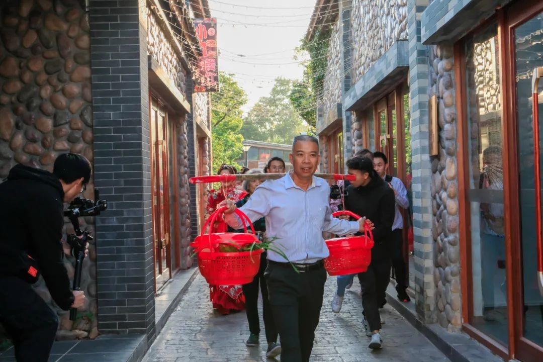 邱阿婆和林阿伯裝燒雞白酒的扁擔(dān)也準(zhǔn)備好了。按照習(xí)俗,大家要挑選一個在村里德高望重的長輩,帶著新人前往玉虛宮祈福,邱阿婆想都沒想,脫口而出:“那阿其挑,讓阿其來挑!焙芸,大家一致推舉出“老村長”廖志其來擔(dān)此重任,他接過扁擔(dān),樂呵呵地領(lǐng)著迎親隊伍往前走。廖志其是這幾對扶貧人愛情的見證者,也是魚咀村的致富帶頭人——很多扶貧項目虧得有其叔在中間做思想工作,幫扶貧人員和村民牽線搭橋,項目才得以順利推進。