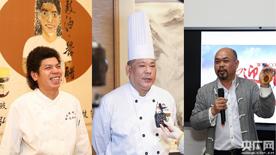 從左到右依次為:旺閣漁村創(chuàng)始人吳榮開、白天鵝包餅房大廚馮立新、中山紅木雕刻大師陳正民。(央廣網(wǎng)發(fā))