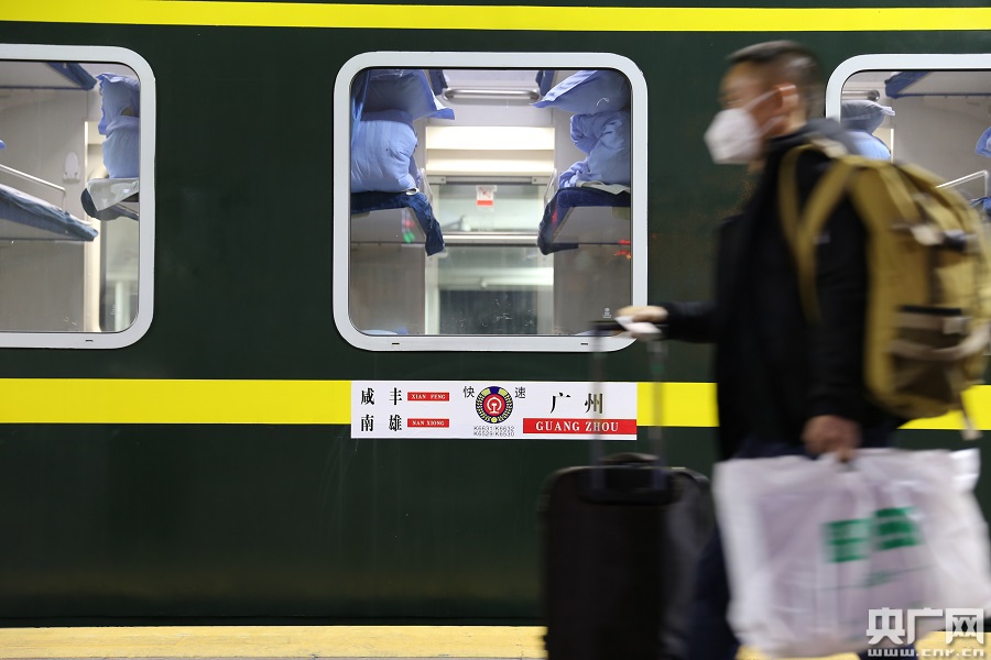 廣州站春運首趟臨客列車Z4190次(廣州—鄭州)于1日28日8點20分抵達(dá)鄭州站。(央廣網(wǎng)發(fā) 李文豪 攝)