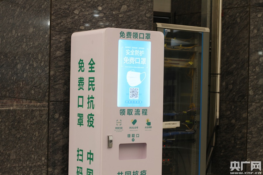 站內(nèi)免費口罩機,旅客可自助領(lǐng)取。(央廣網(wǎng)發(fā) 彭洲 攝)