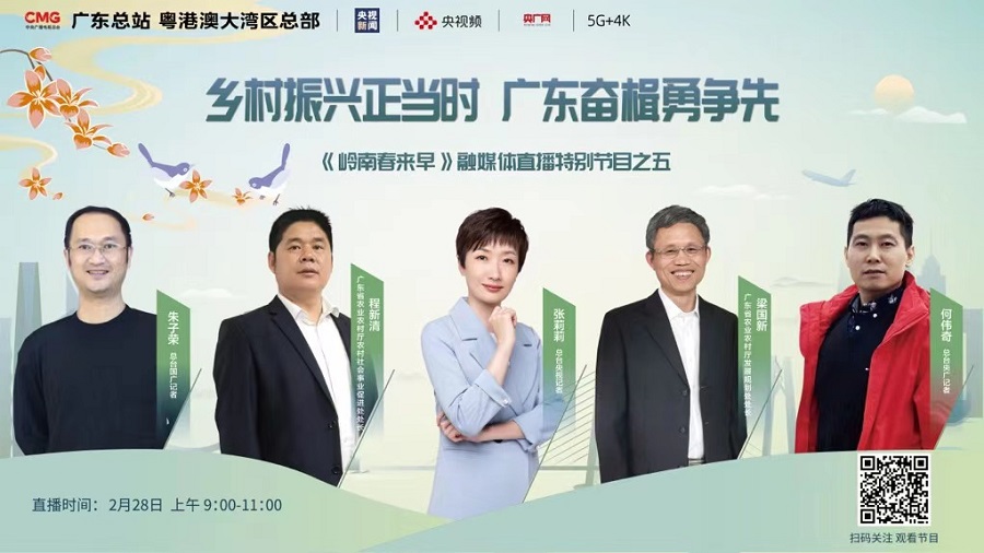 2月26日起至2月28日,中央廣播電視總臺(tái)廣東總站暨粵港澳大灣區(qū)總部推出六期融媒體直播特別節(jié)目《嶺南春來早》,通過央視新聞、央廣網(wǎng)、央視頻等總臺(tái)新媒體平臺(tái),展現(xiàn)廣東在開局之年主動(dòng)作為的奮戰(zhàn)場面。