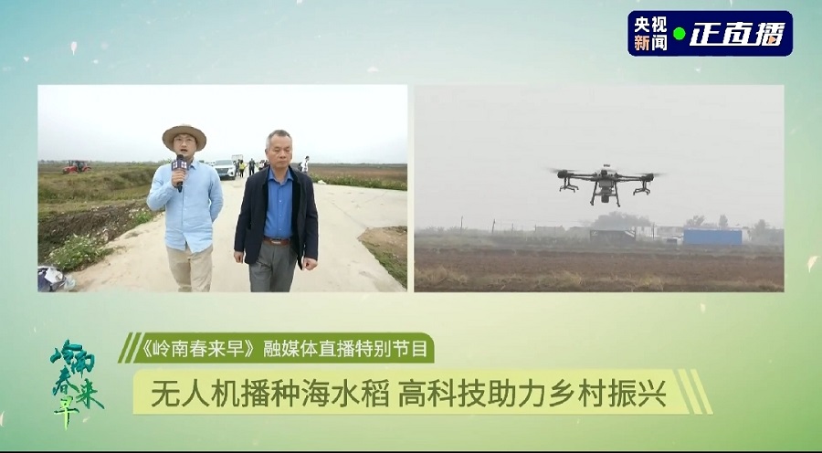 直播中,記者走進(jìn)江門市臺(tái)山市海宴鎮(zhèn),這里有著一片海水稻試驗(yàn)田,農(nóng)用無人機(jī)正在播撒海水稻種子,呈現(xiàn)出一派春耕景象。
