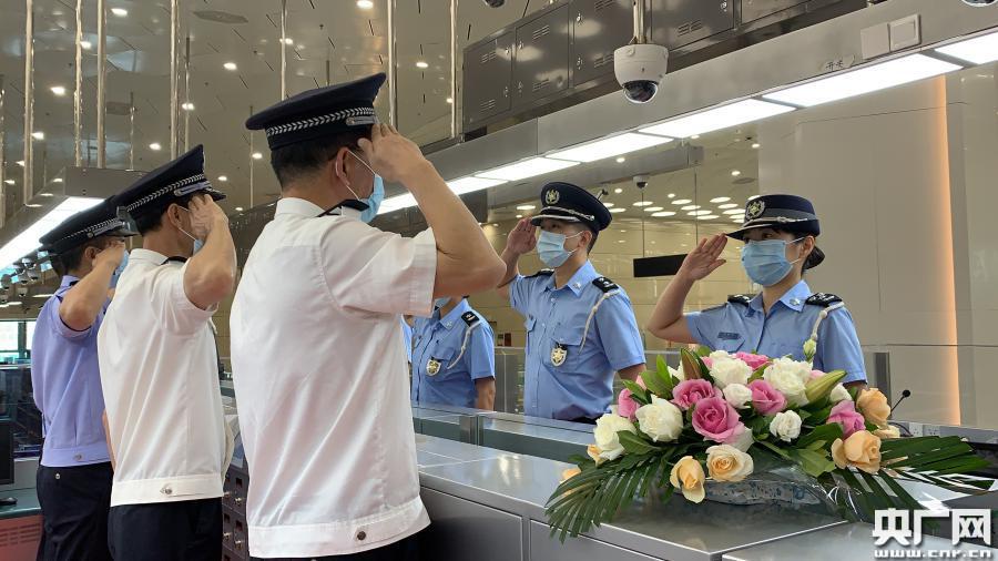 珠海邊檢總站、澳門治安警察局代表在珠澳分界線上互相敬禮、握手,開啟在橫琴口岸合作執(zhí)法執(zhí)勤的嶄新歷史(央廣網(wǎng)記者 陳越 攝)
