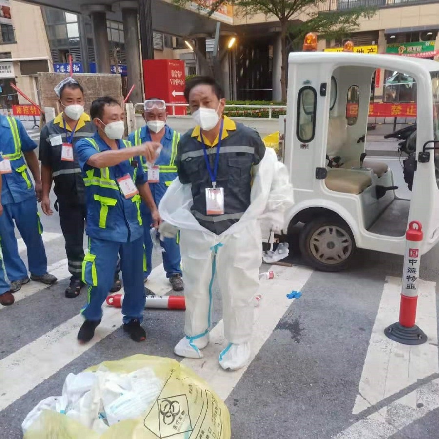 據(jù)介紹,高風險地區(qū)的生活垃圾要經(jīng)過極其嚴格的消殺流程。每到一戶門前,環(huán)衛(wèi)工人要先全面消殺、層層封裝垃圾包裹。此后,全面消殺垃圾袋及周邊環(huán)境,再將垃圾運輸?shù)綐窍轮付ǖ睦悬c,最后再消殺一次才能裝到密封的運輸車上。