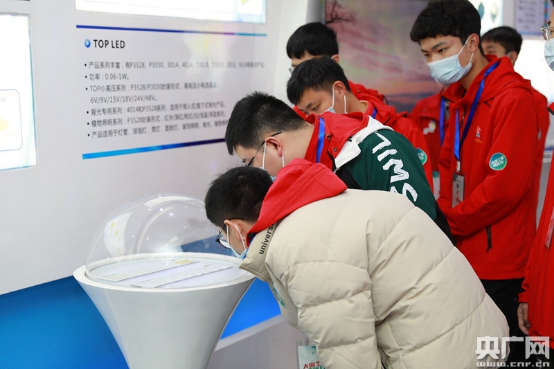 國賽選手們近距離觀察LED產(chǎn)品。(央廣網(wǎng)發(fā))