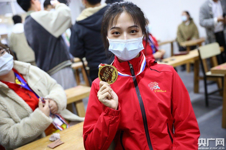 紅木大師親手雕刻“大國(guó)工匠灣區(qū)行”紅木紀(jì)念章贈(zèng)予國(guó)賽選手。(央廣網(wǎng)發(fā))