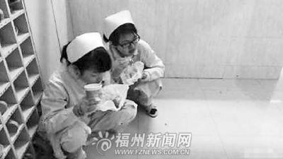 照片中,兩名年輕女護(hù)士正蹲在一個(gè)鞋柜旁,戴著一次性手套,埋頭吃快餐。該網(wǎng)友在微博上說(shuō),照片攝于福州一家醫(yī)院,這是這些護(hù)士的日常夜班狀態(tài),如果遇上大規(guī)模的意外事故,她們可能連飯也吃不上。