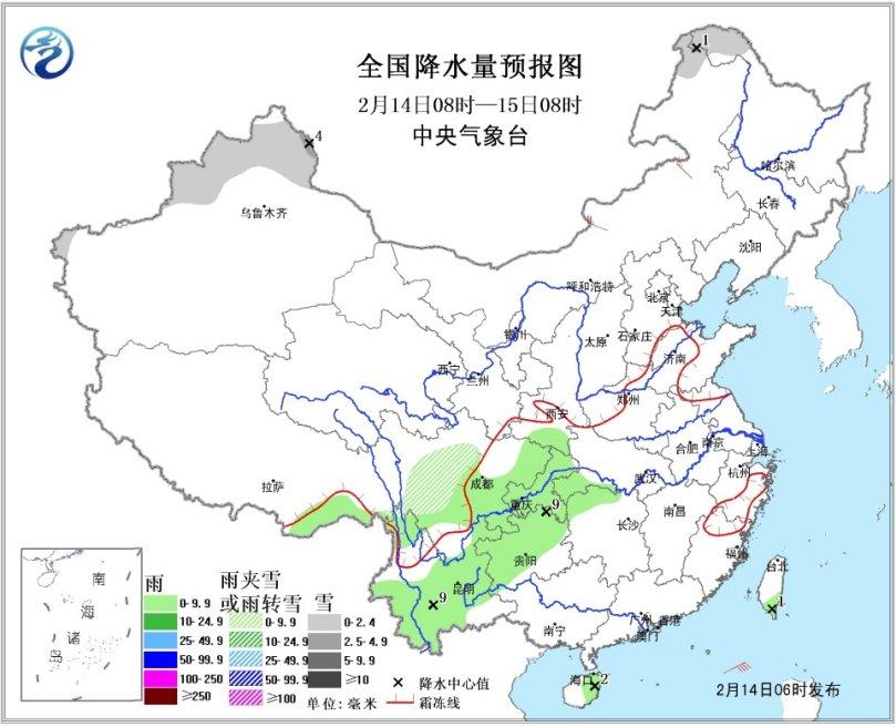 14日08時至15日08時,北疆北部、川西高原中部等地有小雪或雨夾雪,局地中雪;西南地區(qū)東部和南部、西藏東南部、海南東部等地有小雨或陣雨。內(nèi)蒙古中東部有4-5級風(fēng)。(圖1)。