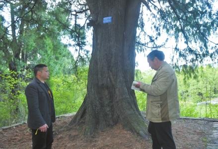 在編號00394的古柏前,劉樹榮和王均林放下雨傘,掏出皮尺,圍著樹干測量。王均林瞄一眼皮尺上的數(shù)據(jù),打開隨身攜帶的本子,記錄下這棵樹的數(shù)據(jù):胸徑185厘米,樹高23米……