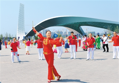 圖為當(dāng)日北京社區(qū)的健身愛好者在啟動儀式上表演抖空竹。