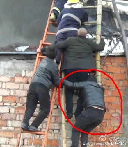 原來,當(dāng)時由于條件限制,云梯車無法順利進(jìn)入現(xiàn)場,消防人員與附近救援民眾只好在廠房外搭梯救人。但廠房有三層高,梯子根本夠不著。為了固定騰空架起的梯子,一個黑衣男子用自己的肩膀頂住了梯子的底部,重壓下,男子身體不停地彎曲,但他始終沒有放下肩上的梯子。
