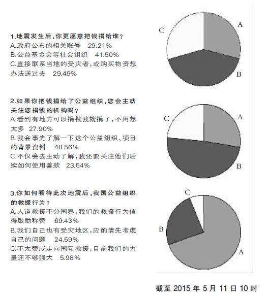 地震發(fā)生后,你更愿意把錢捐給誰?你更傾向于如何捐贈?《公益時報》聯(lián)合新浪公益及問卷網(wǎng)推出本期益調(diào)查,“尼泊爾地震后,你會怎樣捐錢?”從5月6日14時起至5月11日10時止,共有1106位網(wǎng)友參與調(diào)查。