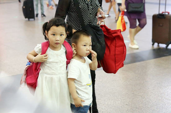 正值2017年暑期,大批“小候鳥”陸續(xù)抵京,與家人團(tuán)聚過暑假。圖為從北京西站出站口走出的兩個(gè)“小候鳥”。