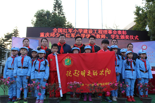 全國(guó)紅軍小學(xué)建設(shè)工程理事會(huì)為重慶邱少云紅軍小學(xué)授校園足球隊(duì)旗,并表彰優(yōu)秀師生