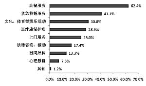 近年來,隨著養(yǎng)老照料中心、社區(qū)服務(wù)驛站等社區(qū)居家養(yǎng)老服務(wù)設(shè)施的逐步建設(shè)和服務(wù)內(nèi)容的不斷豐富,老人對社區(qū)養(yǎng)老服務(wù)的需求也日趨旺盛。調(diào)查顯示,80.3%的被訪老人對社區(qū)居家養(yǎng)老服務(wù)有需求。從服務(wù)內(nèi)容看,助餐服務(wù)是被訪老人首選,選擇比重為62.4%,其次是緊急救援服務(wù),選擇比重為41.1%,文體娛樂活動、醫(yī)療康復護理和上門服務(wù)的選擇比重在25%-30.8%之間。此外,在有上門服務(wù)需求的被訪老人中,上門醫(yī)療呼聲最高,選擇比重為76.6%。