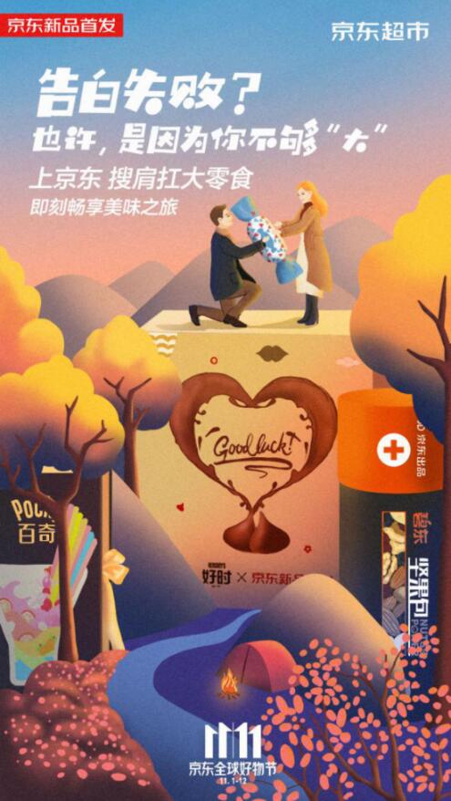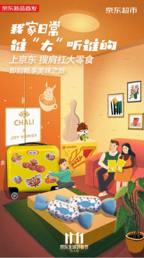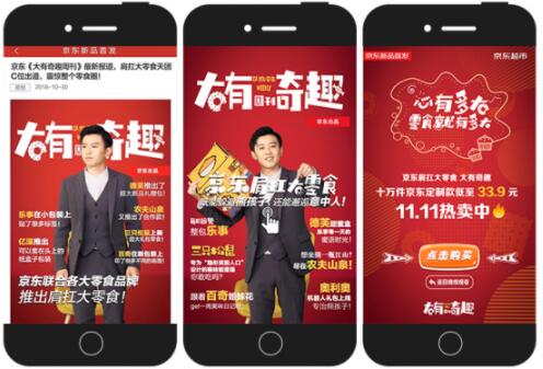 這些專(zhuān)為京東11.11定制的肩扛大零食禮包立刻以醒目又有趣,好吃又好玩的個(gè)性特點(diǎn),成為了線上傳播最有效的道具,不僅成功助力京東超市11.11的提前布局,也贏得了大量年輕人的青睞。