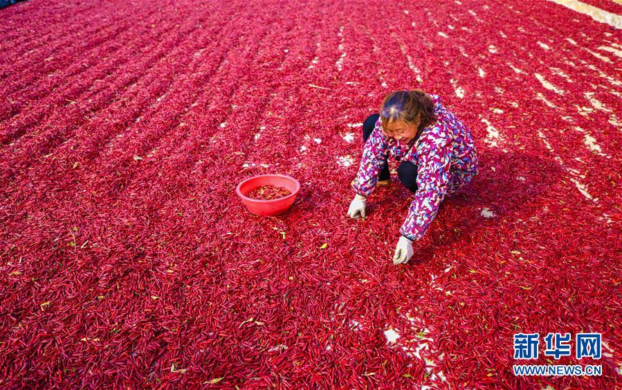 11月18日,在衡水市冀州區(qū)周村鎮(zhèn)辣椒加工交易基地,椒農(nóng)在對摘好的辣椒進行二次篩選。