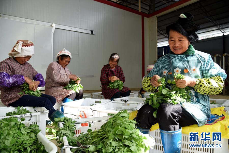 11月25日,在貴州省黔東南苗族侗族自治州榕江縣,當(dāng)?shù)貗D女在三鑫天源生態(tài)農(nóng)業(yè)公司整理蔬菜。