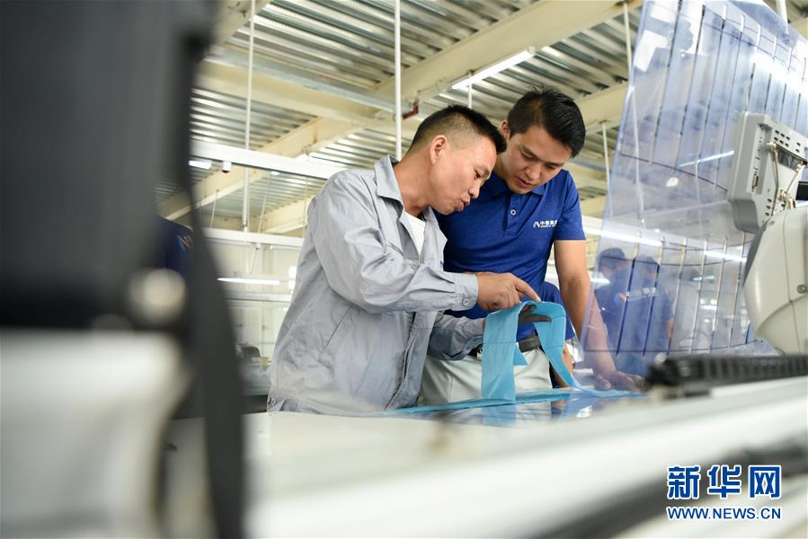 在新疆和田一家服裝公司,技術(shù)員麥提托合提·艾克木(右)向內(nèi)地技師學(xué)習(xí)先進的制衣工藝(8月25日攝)。